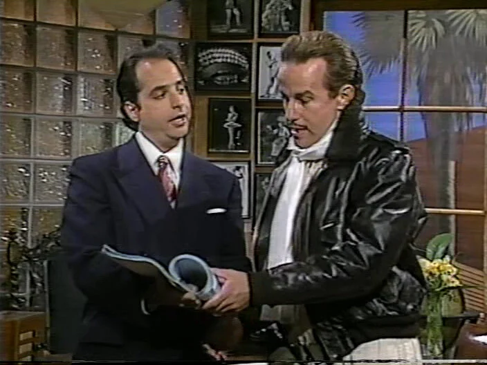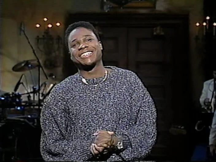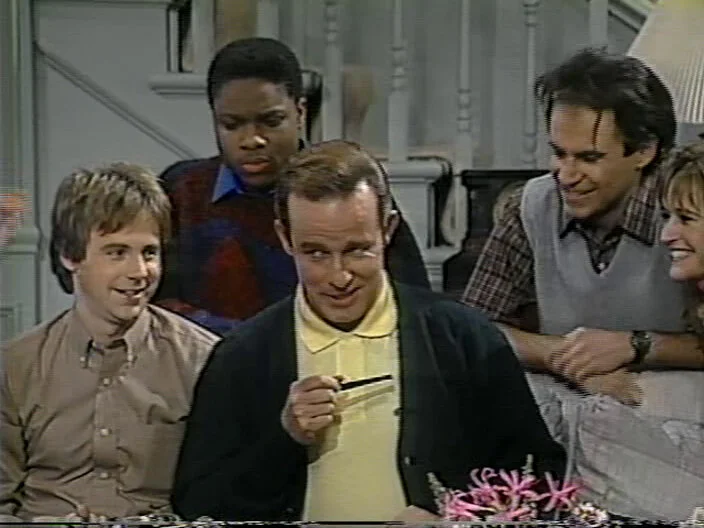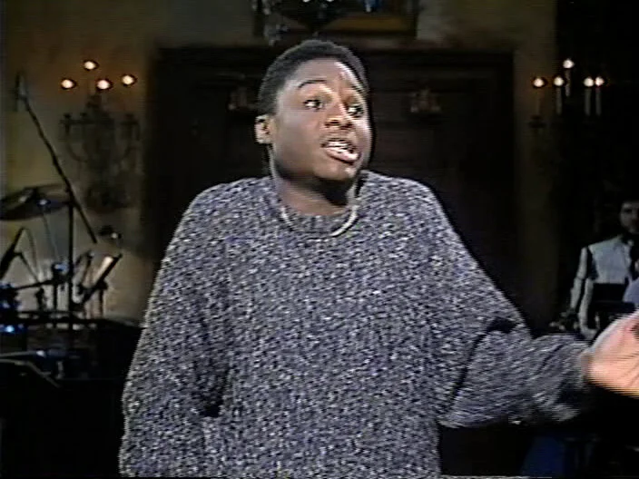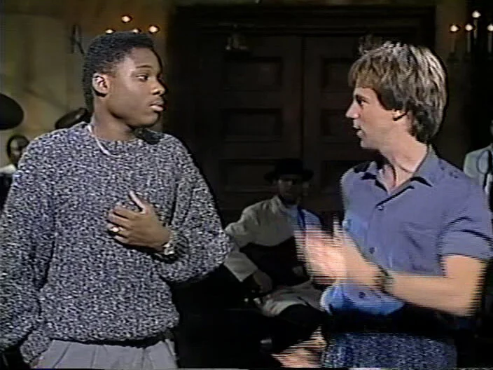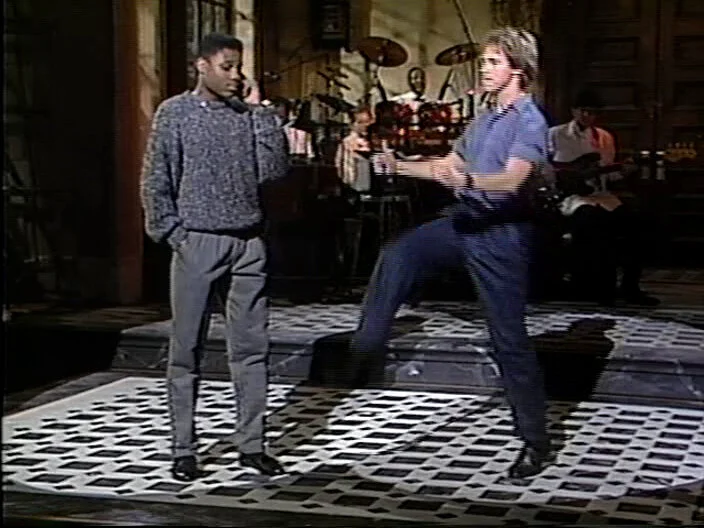 Malcolm-Jamal Warner says “Thanks for coming, thanks for watching!” Sam Kinison screams. Nora Dunn comes onstage in a bathrobe. Jan Hooks, Phil Hartman, Kevin Nealon pal around; Victoria Jackson and Dennis Miller chat. A. Whitney Brown is in his Ed Jaymes outfit.