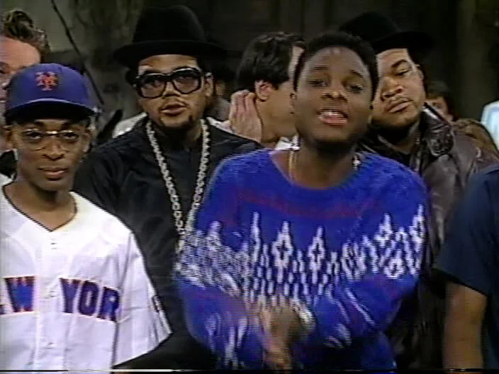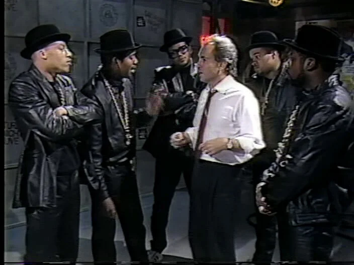 Mars Blackmon (Spike Lee) discusses criticism of rap and says his old friends Run-DMC aren’t violent as they manhandle Lorne Michaels.