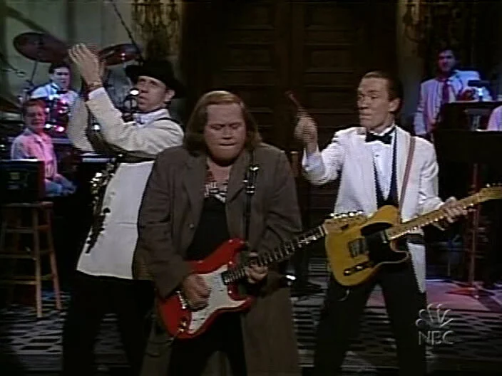 The use of the SNL Band members plus Marc Shaiman playing live really adds a lot to this sketch, as well as the visible cigarette smoke that occasionally comes into frame during Lovitz’s solo number.