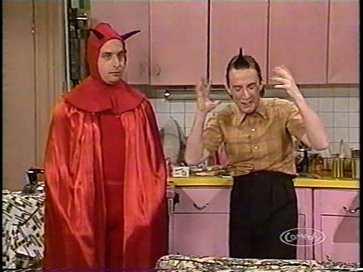 Rerun alterations: This entire sketch is replaced with the dress rehearsal version. There are some very noticeable differences between the two: in the live show, Martin Short has his earmuffs on for the whole sketch and his hair point doesn’t quite stick together for the whole sketch. As well, the picture of Pat Sajak isn’t crooked when Ed first notices it is, the lines about the Devil’s other names and the gifts Ed plans to give to each of his relatives were cut after dress, and Jon Lovitz has trouble removing the triangle from his cape in the live show.