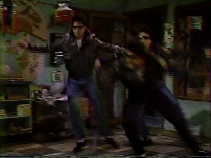 Rerun alterations: Audience occasionally mixed quieter. Earlier camera switch after Harmon goes through window to remove him turning around. Different camera angle used for part where the guys get up off the floor.