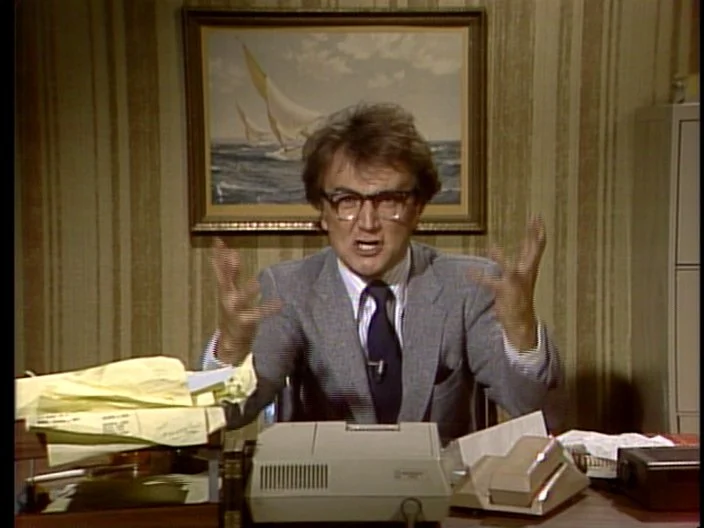Bill Needle (Dave Thomas) expresses his frustration at his show being cut down to 7 and a half seconds.