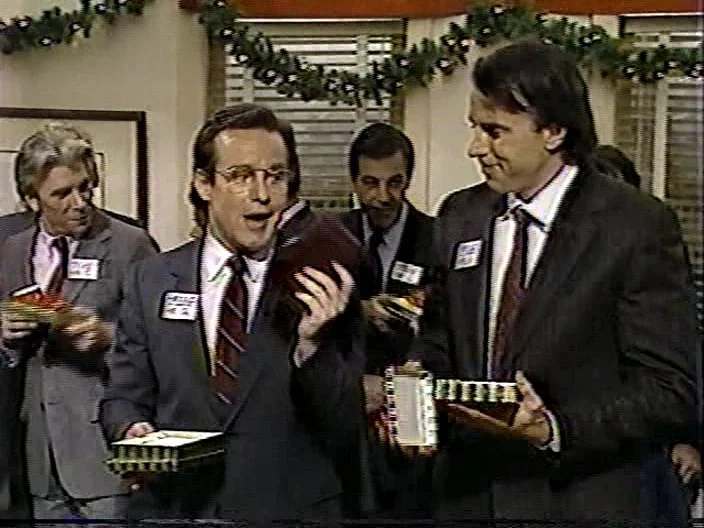 This is the third (and last) Christmas show in a row with a Sweeney Sisters medley; as well, the last time we saw them on SNL was on the 1987-88 Christmas show (Dunn and Hooks did a Sweeneys routine on that year’s Lorne Michaels-produced Emmy Awards in August).